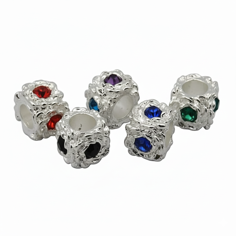 Декоративно метално мънисто с вградени кристали, подходящо за Пандора стил гривни, твърди гривни и колиета. Сребристият обков подчертава блясъка на камъните.