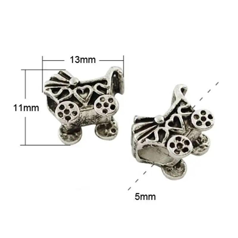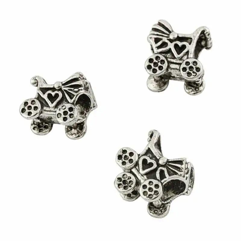 Мънистото „Детска количка“ е изработено с внимание към детайла – от малките колелета до декоративните орнаменти по корпуса. Ефектът на „антично сребро“ се постига чрез специално патиниране, което подчертава релефа и придава на бижуто благороден, леко остарял вид. Големият отвор от 5 мм прави този елемент изключително функционален и лесен за нанизване.