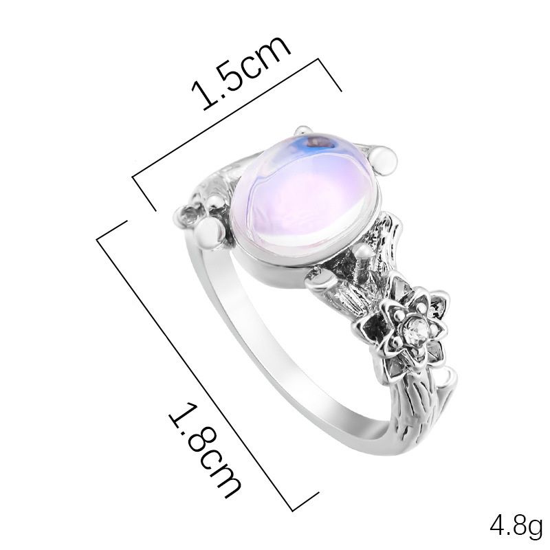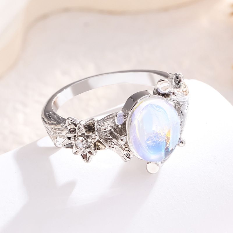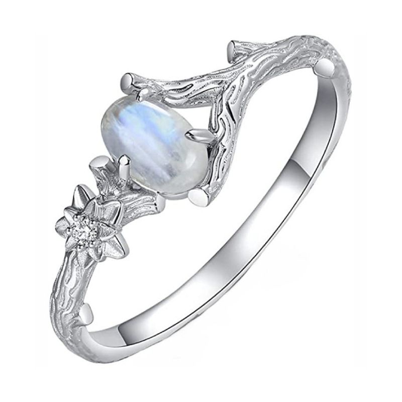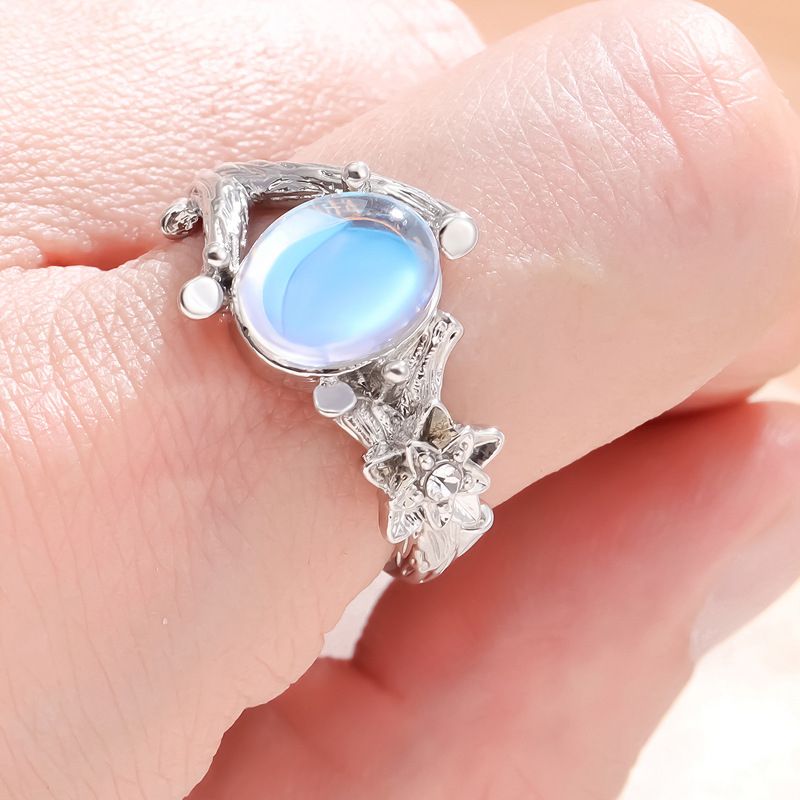 Пръстенът е изработен с фин лунен камък, който отразява светлината по уникален начин, създавайки нежен и мистичен блясък. Дизайнът е вдъхновен от природата и включва детайли наподобяващи клонки, както и малко цвете, което добавя нежност и женственост.