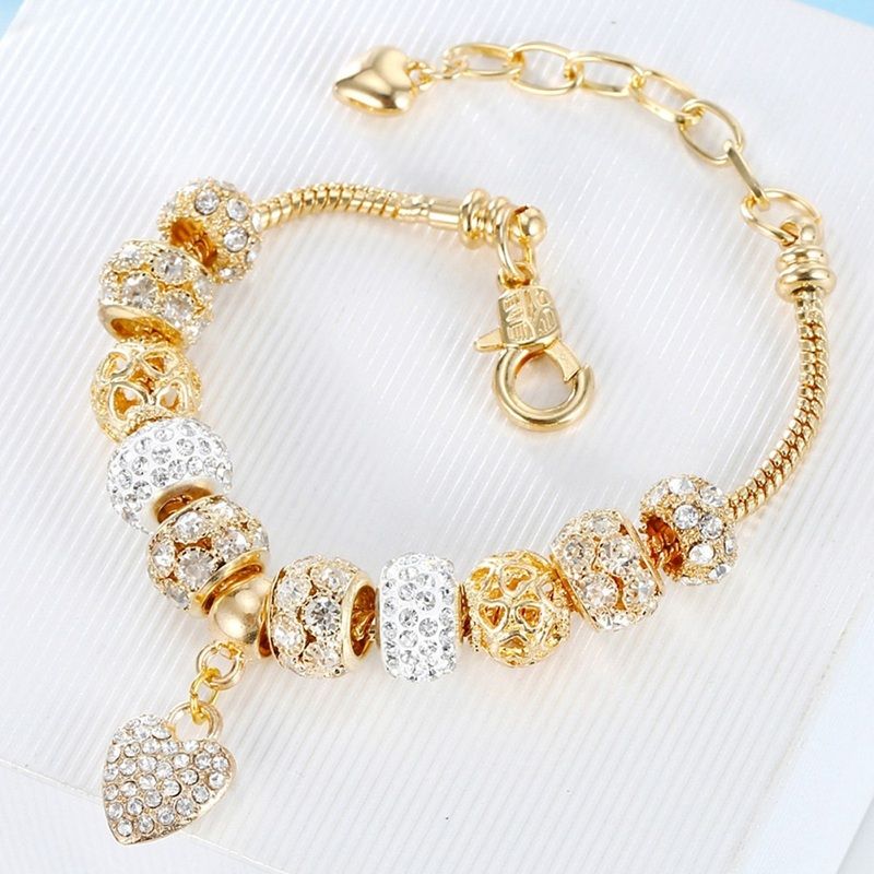 Елегантна гривна, изработена от златиста сплав и блестящи кристали. Верижка с плетка тип "змийска кожа" и европейските мъниста с голям отвор придават уникален и стилен вид на бижуто.