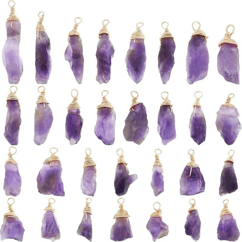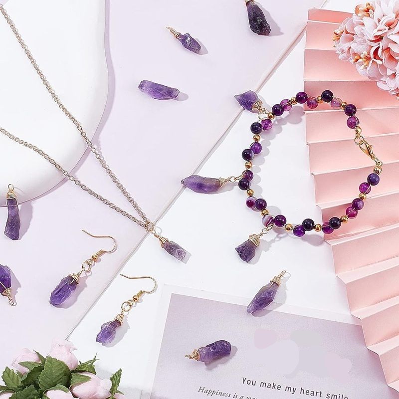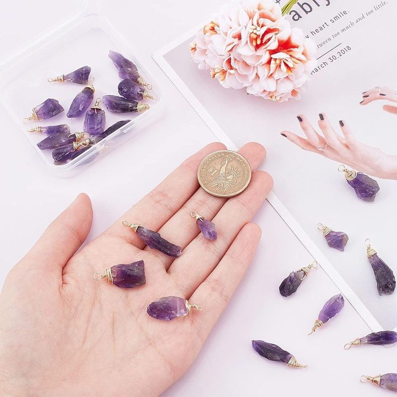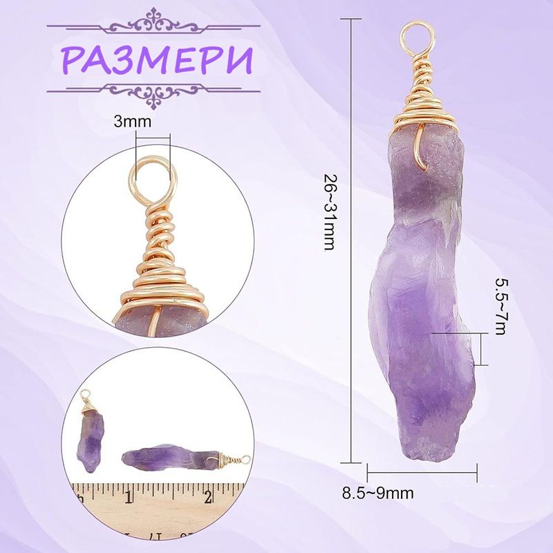 Добавете естествен блясък към вашата колекция с висулка от необработен аметист с 18-каратова позлатена медна тел