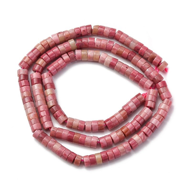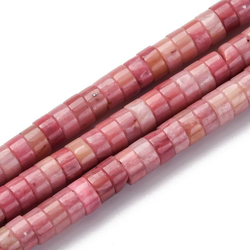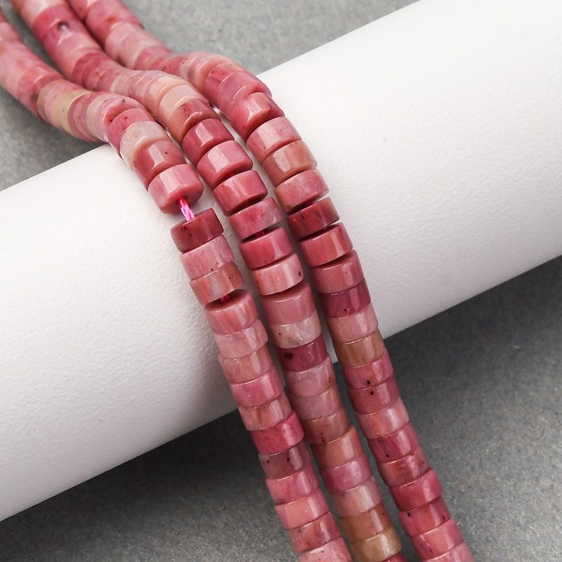 Наниз от естествен родонит, предлагащ красотата на природата във вашата работилница. Мънистата са с форма на диск (Heishi) с размери 4.5x2.5 мм, отличават с нежен розов цвят с различни нюанси. Родонитът придава топъл и земен вид на всяко бижу.