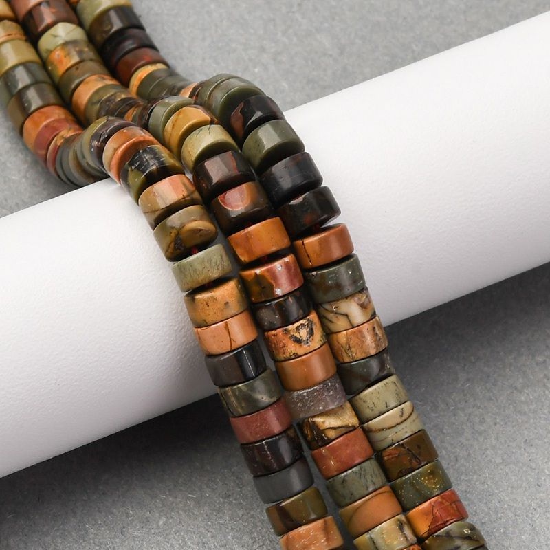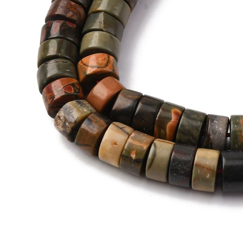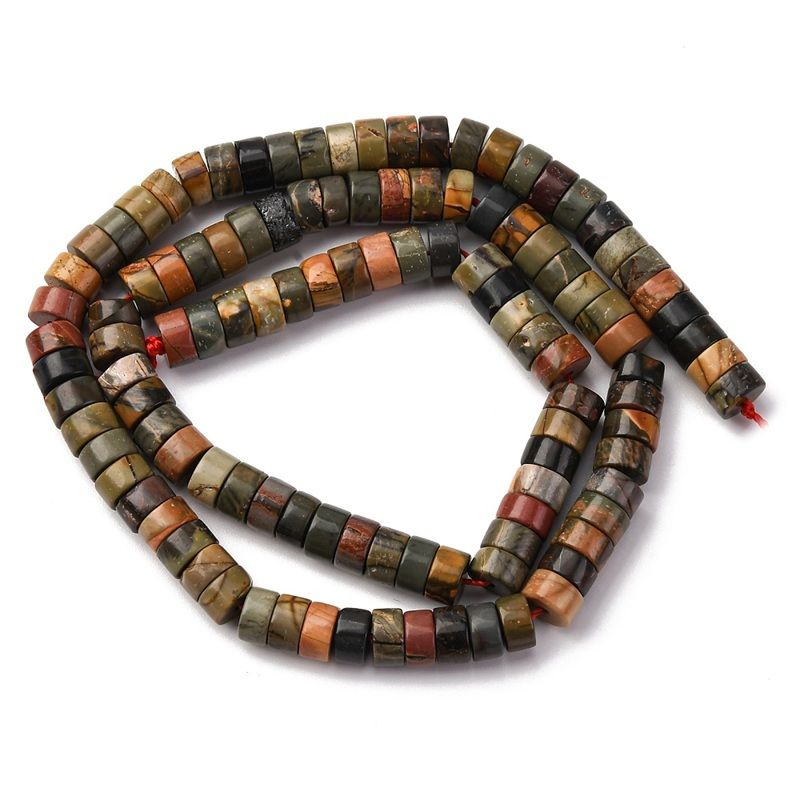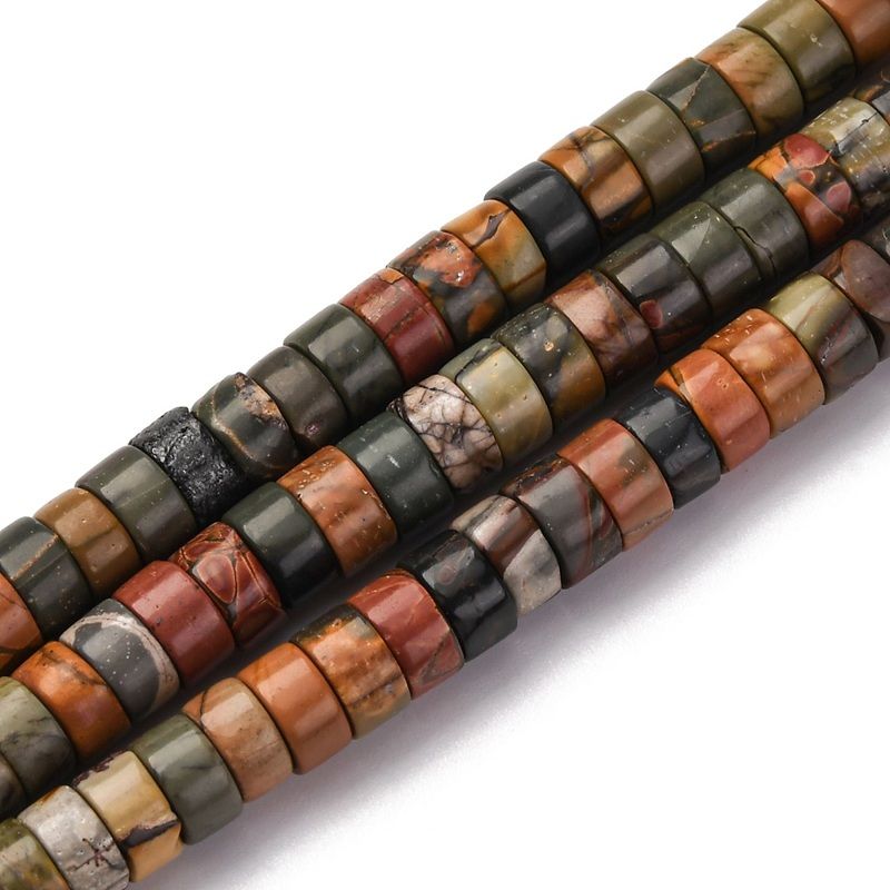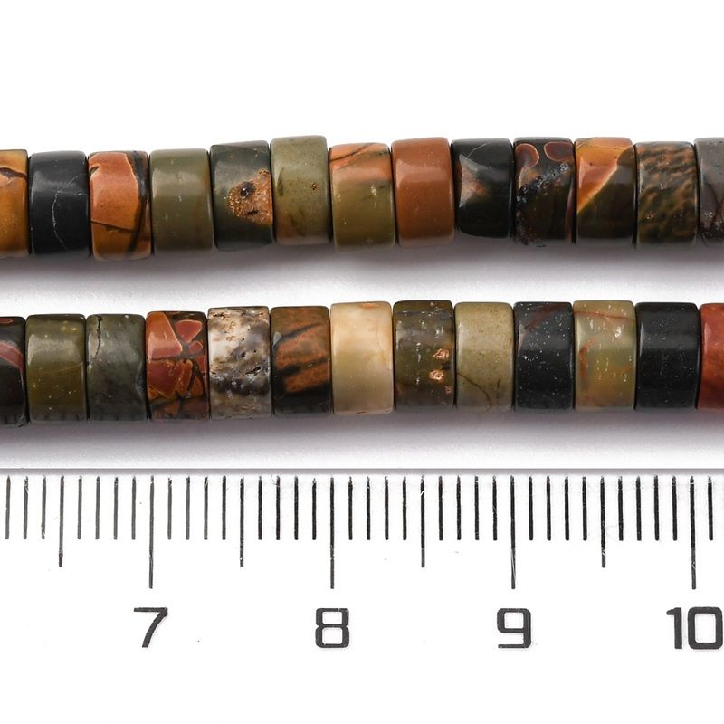 Разноцветни мъниста от естествен яспис "Пикасо" с форма на диск (Heishi). Подходящи за създаване на уникални бижута. Всеки наниз съдържа приблизително 113-114 мъниста.