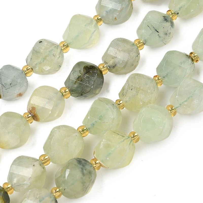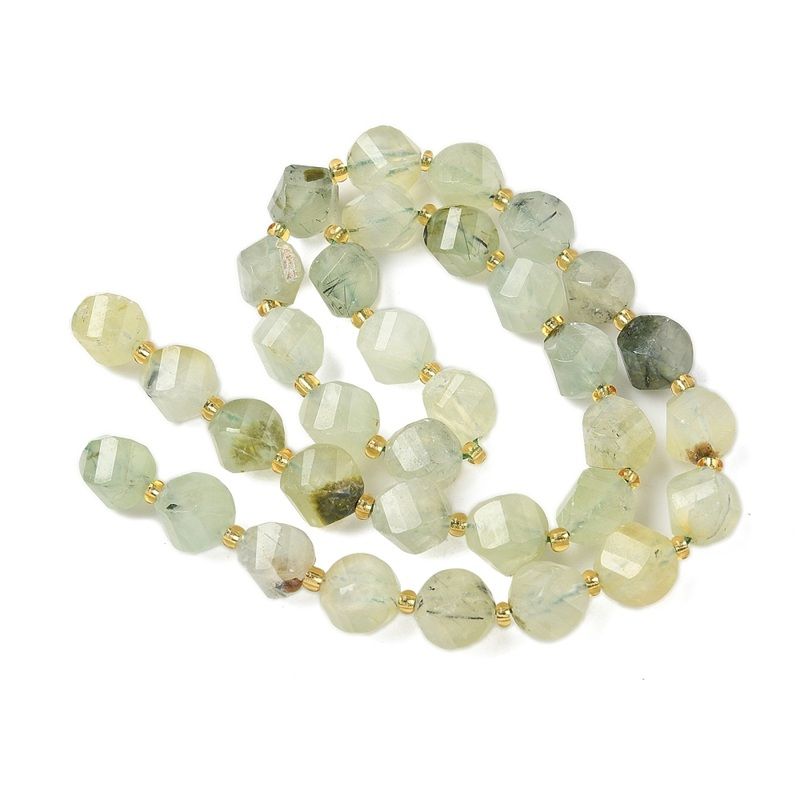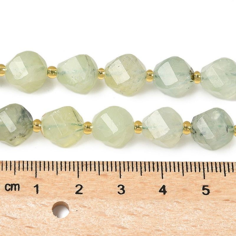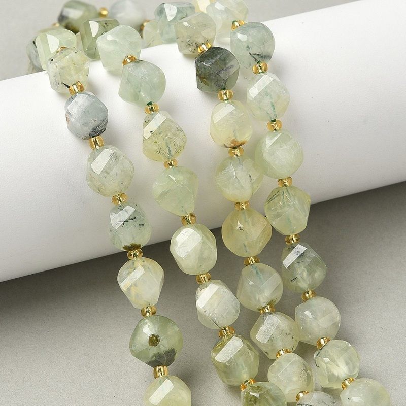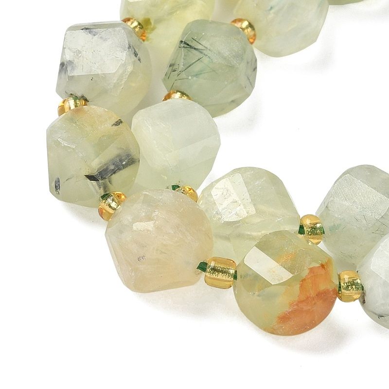 Мъниста от естествен пренит притежават нежен, пастелен прозрачно зелен цвят, който предава спокойствие и елегантност на всяко бижу. Фасетираната обработка на повърхността им създава деликатен блясък, който улавя светлината и придава допълнителен чар. Между мънистата има разделителни 2 мм синци със позлатен отвор, което прави наниза неповторим.