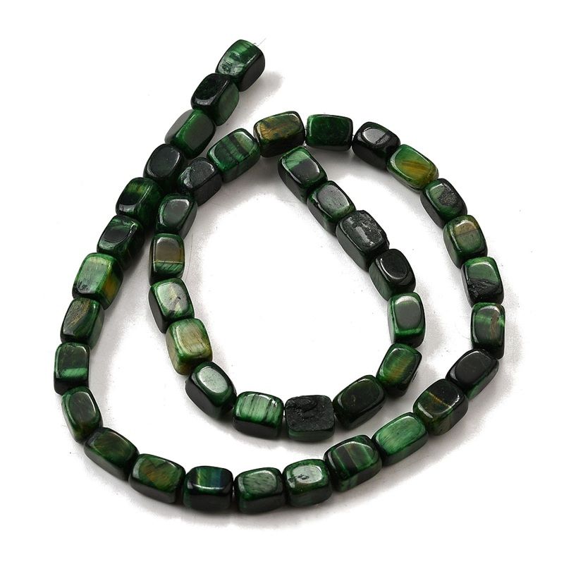 Мъниста от Тигрово Око с наситено зелен цвят, който е добавен допълнително с цел, създаване на модерна цветова гама. Кубоидната форма с леко заоблени ръбове придава модерен и изчистен вид.