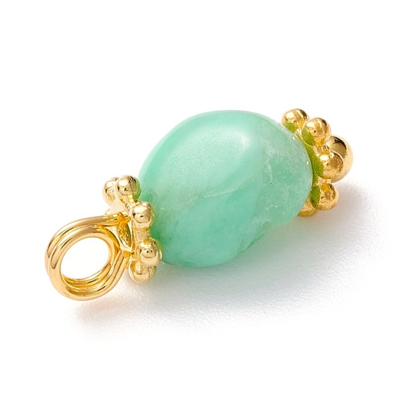 Тази висулка е идеална за създаване на уникални огърлици, гривни и обеци. Комбинацията от хризопраз и месинг предава топлина и изтънченост на вашите дизайни.