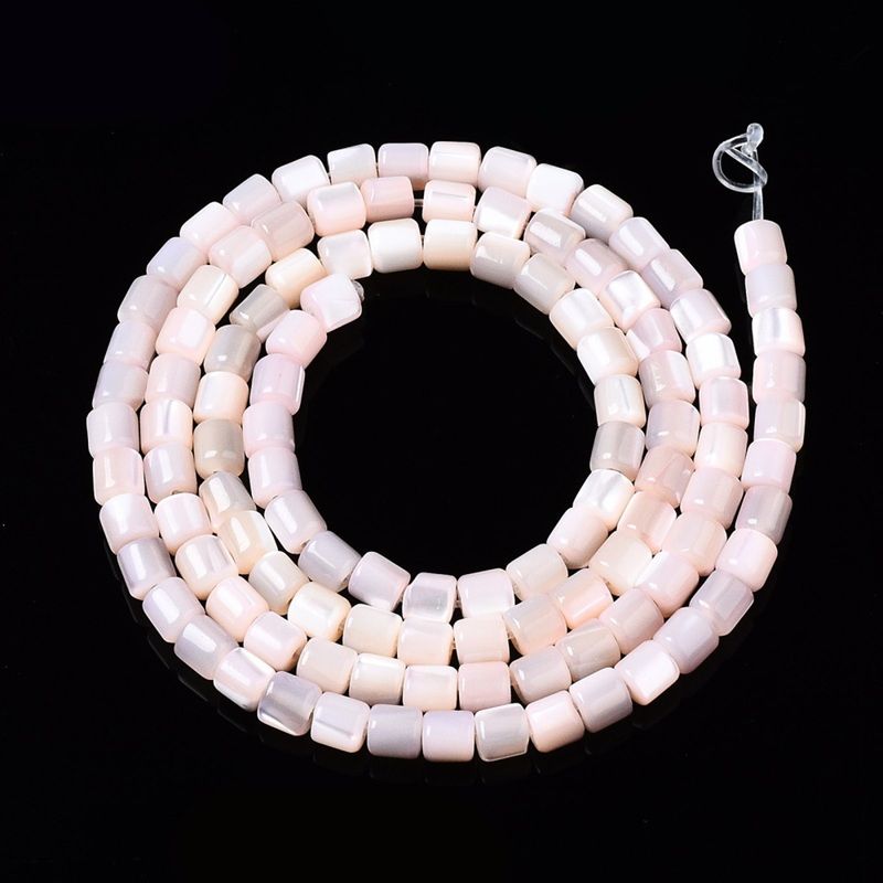 Естествени цилиндрични мъниста, изработени от седеф на морски охлюв Трохус, с добавен, деликатен розов седефен блясък. Подходящи за изработка на гривни, колиета и обеци в бохо или морски стил.