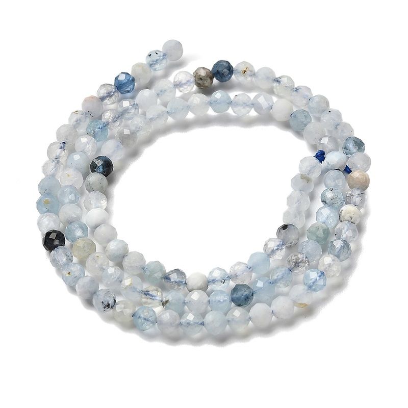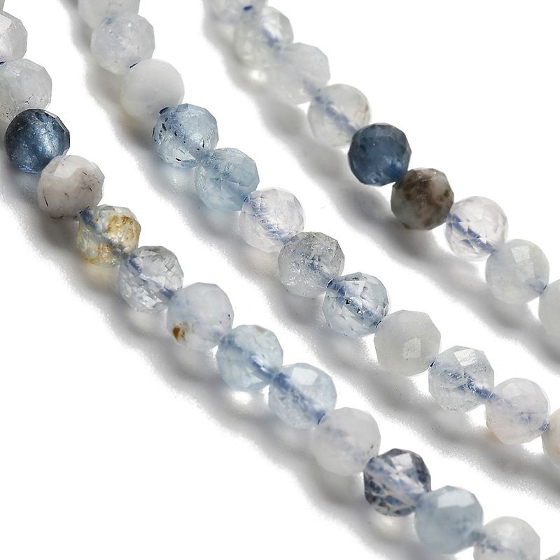 Естествен аквамарин, нетретирани мъниста – фасетирани ~3,5 мм с нежен небесносин блясък. Подходящи за гривни, многоредни колиета и деликатни акценти.